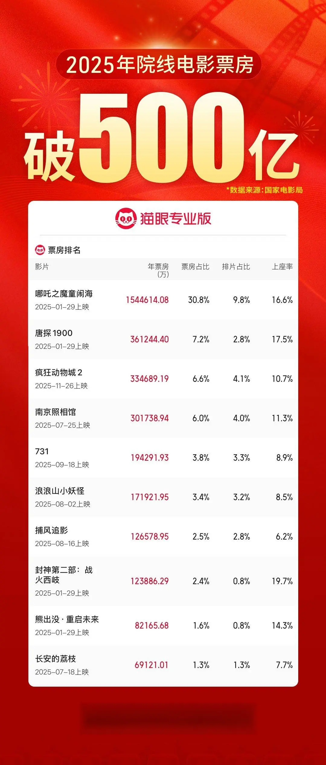 根据猫眼专业版数据,年度票房前十名的影片分别为《哪吒之魔童闹海》《唐探1900》《疯狂动物城2》《南京照相馆》《731》《浪浪山小妖怪》《捕风捉影》《封神第二部:战火西岐》《熊出没·重启未来》和《长安的荔枝》。其中,国产片占据九席,动画电影占据四席,30亿以上的影片共有四部,头部影片带动作用显著,仅《哪吒2》一部影片的单片票房就高达154亿,占全年票房的30%以上。