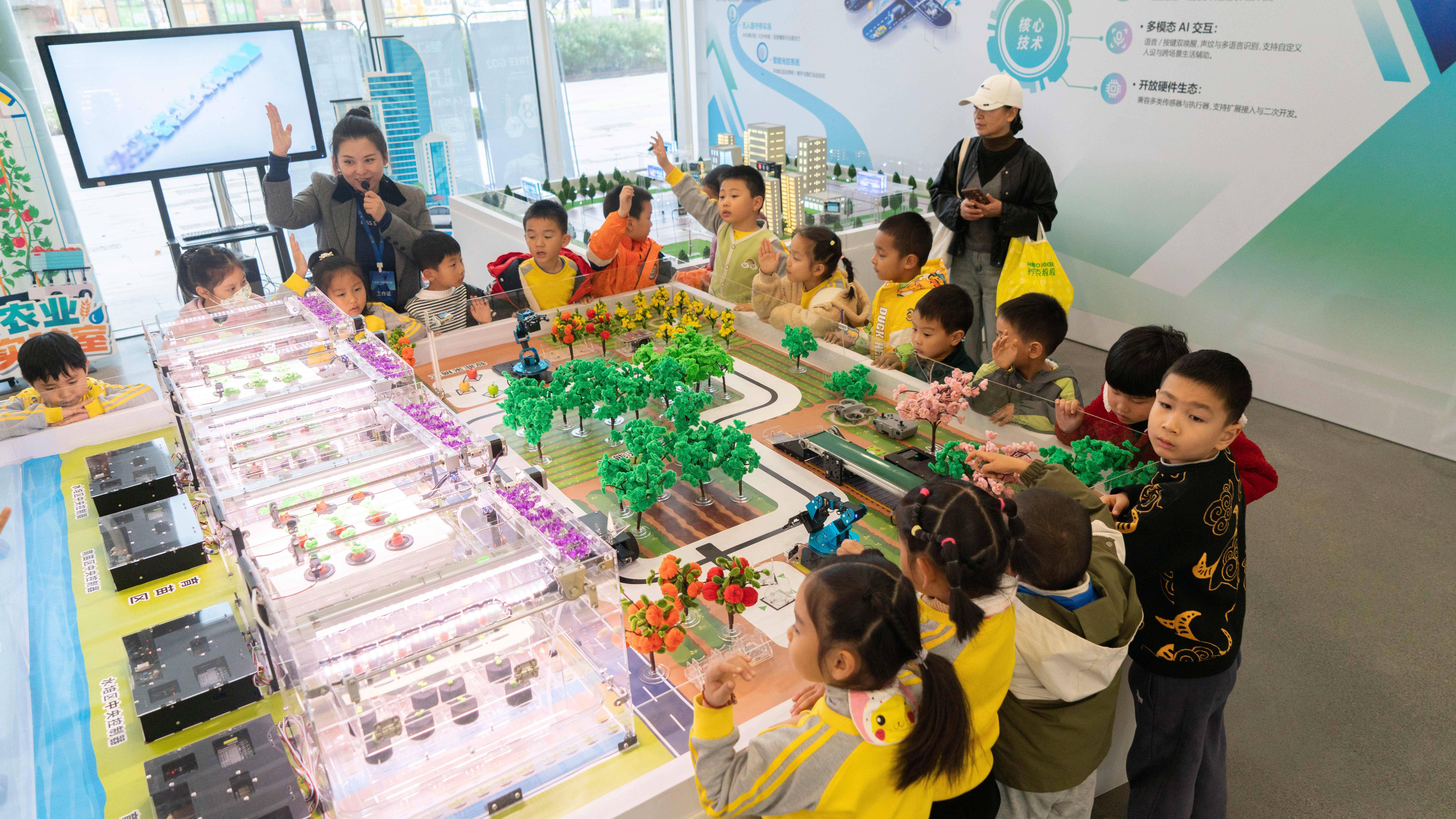 小朋友们与老师合影留念。人民网张志强摄近日,武汉市爱思学青城华庭幼儿园70名小朋友在老师带领下,走进人民网・梦幻灵境AI展演中心(武汉)开展AI启蒙研学。这场寓教于乐的科技体验,既让孩子们近距离感受到前沿智能技术的魅力,也在他们心中悄然播下了崇尚科学、探索人工智能的种子。