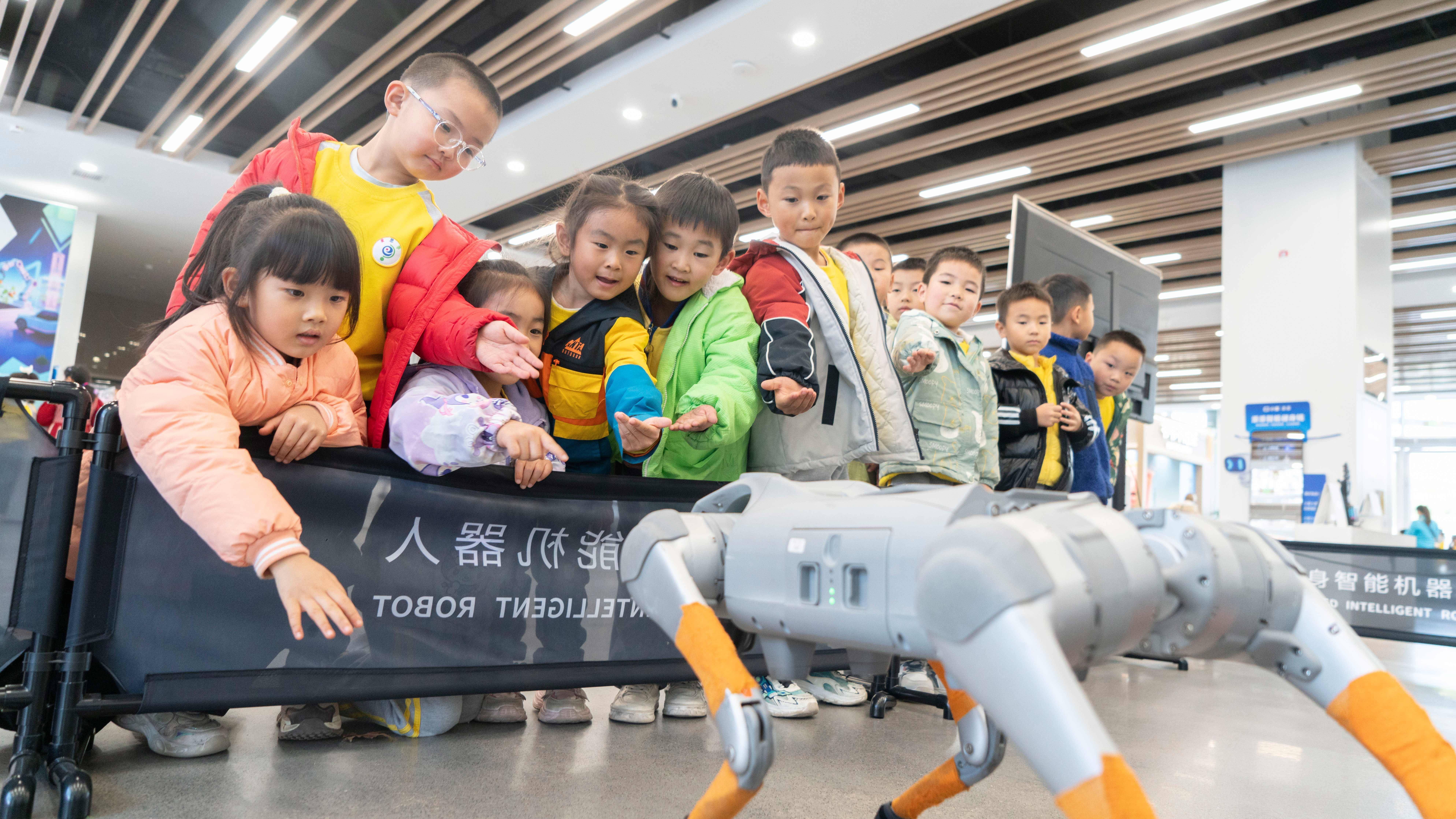 小朋友们与机器狗互动。人民网张志强摄